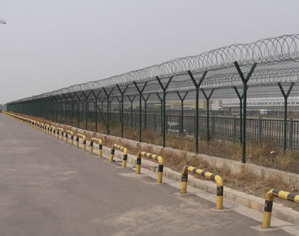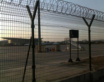 機(jī)場護(hù)欄網(wǎng)又稱作“Y型安全防御護(hù)網(wǎng)”,是由V型支架立柱,加強(qiáng)型焊接片網(wǎng),安全防盜連接件和熱鍍鋅刀片刺籠組成強(qiáng)度和安全防御性級別很高。近年來,被廣泛應(yīng)用在機(jī)場,軍事基地等高安全場所。注:如果在機(jī)場護(hù)欄網(wǎng)頂部加裝刀片刺絲、刀片刺繩后又很好的增強(qiáng)了安全防護(hù)性能。