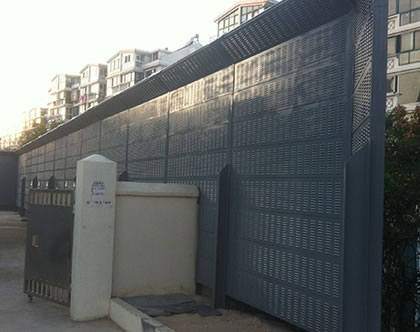 廠區(qū)聲屏障的主要組成部件: 基礎、立柱、屏體、固定件、密封件,有的還包括頂部結(jié)構(gòu)。